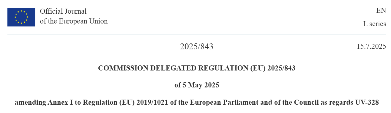 On July 15, 2025, an amendment was published adding UV-328 to Annex I (Prohibited Substances) of the EU POPs Regulation.
