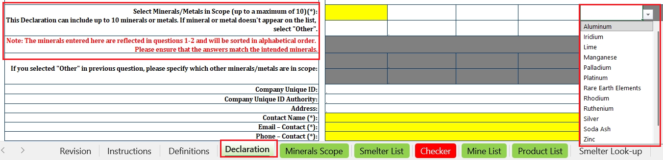 Declaration tab: Added explanatory text within the mineral reporting scope selection field & Modified the method for selecting the mineral reporting scope