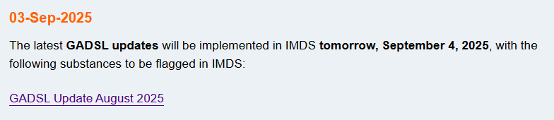 The updates to the Global Automotive Declarable Substance List (GADSL), revised as of August 4, 2025, have been applied to IMDS on March 14, 2025.