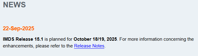 On September 22, 2025, the Release 15.1 changes were announced thru the IMDS News. These changes are scheduled to be implemented on October 18 and 19, and the planned seven updates are as follows: